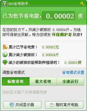 360省电助手模式选择:标准省电、最大省电、全速运行 你可以关闭一些平时不常用的设备,这样可以延长这些设备的使用寿命,节省一部分电能。如果不需要光驱来读写光盘,建议关闭,如果不需要使用modem拨号上网,建议关闭,如果不需要使用蓝牙键盘、鼠标设备,建议关闭,如果不需要使用摄像头设备,建议关闭。如果没有音箱、耳机等音频播放设备,建议关闭。 自动关闭不使用的电脑设备以节约电能(仅支持vista/win7)。你可以自定义设置省电方案的一些参数,让360省电助手更好地帮你省电