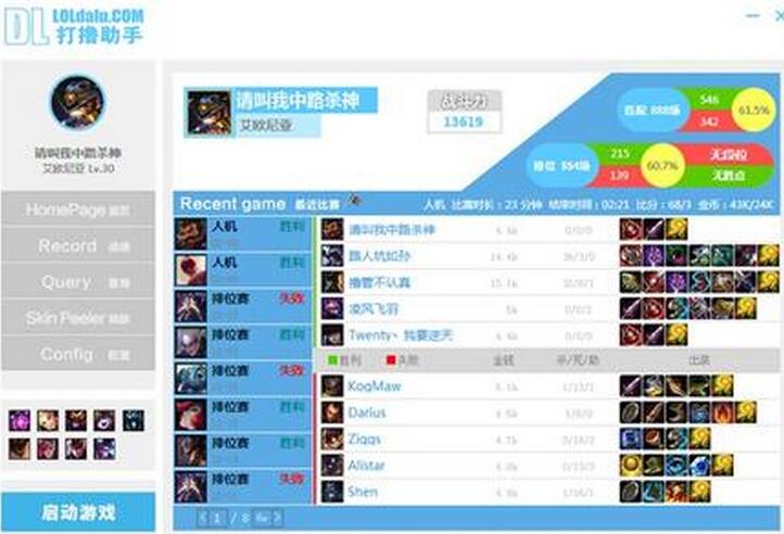 供了官方皮肤和自制皮肤更换功能,还有战绩查询、界面更换等功能