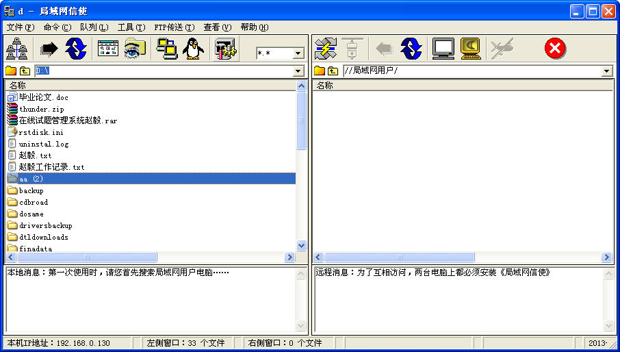 3.假如有两台电脑分别安装了windows7和XP两种操作系统,很多人可能不会设置“网上邻居”进行互访;还有如果共享文件夹里面没有你想要的文件,还得经常修改共享目录。现在《局域网信使》可以跨越两种操作系统平台,直接传输任何文件夹,不再需要共享文件目录了。