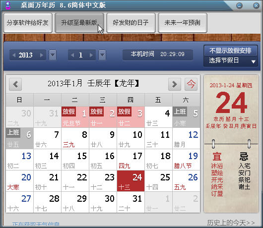 一款日历方面的小工具,,能够显示农历、星期等方面的小工具。软件画面协调,小巧简便,是日历软件中的精品。 支持显示实时节气、日期、节日、阴历、阳历、黄历、标准北京时间等强大功能。哥向您推荐的原因:1、本站呕心沥血的原创,2、绝对绿色,安全无毒,3、哥推荐的都是极品。
