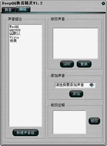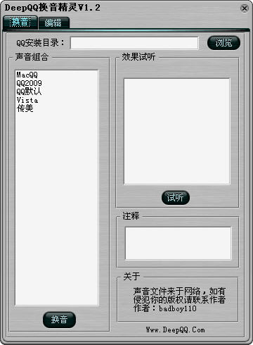 内置多种声音方案,个性化QQ使用。 DeepQQ换音精灵1.2 1.自动判断运行中的QQ安装路径,可手动选择安装路径 2.自动判断QQ版本(08还是09版)支持09版QQ 3.美化界面