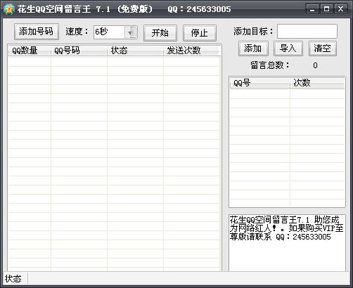 登陆190个号码 建议速度1秒 登陆100个号码 建议速度2秒登陆50个号码 建议速度4秒登陆25个号码 建议速度8秒 ...... 用以上方法就不需要验证码了。购买vip正式版,可以无限刷,无验证码限制。每天刷20万留言不是问题!