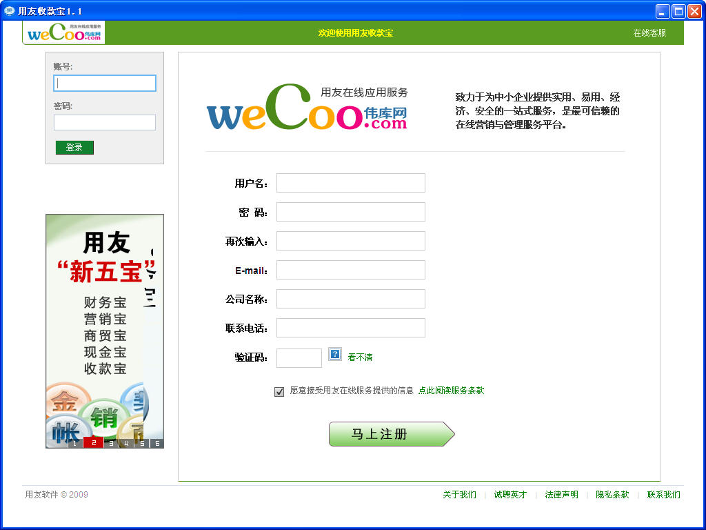 用友伟库收款宝是基于互联网模式、专为项目型销售的企业提供集合同、回款、费用和服务管理为一体的服务。应用收款宝,能够帮助企业监督回款计划及执行的全过程,估算合同的收入与毛利,同时完善服务流程和反馈响应机制、促进服务质量持续提升,提高客户满意度和忠诚度,从而保障企业业务管理的稳定有序。为什么选择收款宝? 1、提升客户满意忠诚,获得稳定持续收入; 2、围绕合同查看进度,控制项目费用成本; 3、高效处理应收账款,持续提升服务品质; 4、避免财务坏账风险,确保服务执行到位。