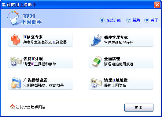 3721上网助手是一款为您网上冲浪而精心打造的实用软件。它不光能够方便的清理您浏览网站遗留下来的临时文件,讨厌的浏览器下拉列表网址,涉及隐私的cookies文件,还可以为您屏蔽恶意网站,消除QQ尾巴,保护IE不被窜改,拦截弹出窗口广告,更提有网络加速功能,让您的网络传输速度再上一个新的台阶。精彩功能等待挖掘,还不快快试 ·扫描第一:全面扫描并修复多达160个可疑位置(3倍于同类软件)! ·修复第一:彻底查杀3878个恶意脚本及精选的1200种流行木马! ·服务第一:拥有覆盖全国的恶意代码提取系统,保证每周更新! ·技术专利:首创驱动保护、全系统扫描、一键修复3项国家发明专利! 全面扫描并修复多达160个可疑位置(3倍于同类IE修复软件)!超出被圈内人盛赞的HijakeThis...