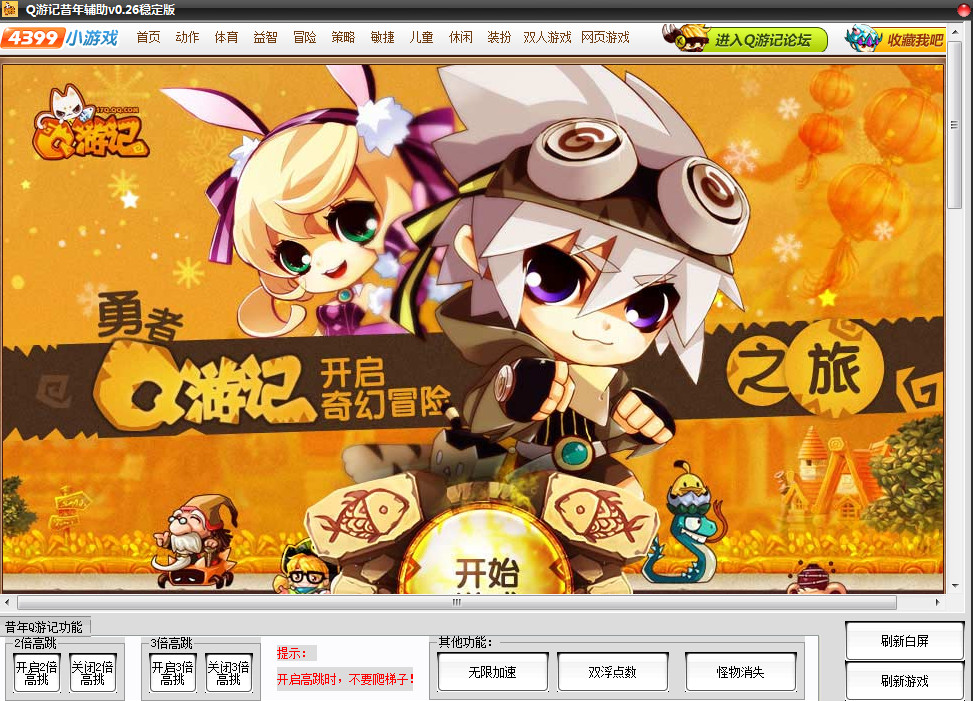 Q游记昔年辅助其实就是腾讯开发的《Q游记》游戏的最强辅助工具。不但优化了操作界面,而且还让大家免费获得3倍高挑、无限加速、怪物消失等功能,从而更加愉快的在里面进行玩耍,喜欢的都可以来到这里进行下载!