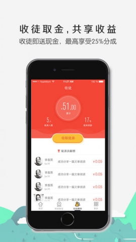 2.【收徒赚佣】在唐三赚收徒页面,点击收取徒弟,发送收徒链接到朋友圈或发送给好友,好友点击链接进入关 注公众号即可领取0.5元现金提成。徒弟分享文章到朋友圈,最高可得到徒弟佣金的25%,徒弟越多佣金比例越高 !