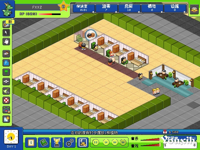 《帝国度假村》作为一款经营类游戏,你的目的就是让你的度假村设施更加完善,赚更多的Money,当然建造房屋,铺设道路,种植各种植被等等元素游戏都有包含。在游戏开始时会有个游戏教学,可以让玩家少走许多弯路。游戏的游戏中玩家可自由调节游戏的进度。游戏已经汉化,尽管功能提示界面,各个按钮排列的比较密集,玩家只要略微查看即可明白各个板块的作用。