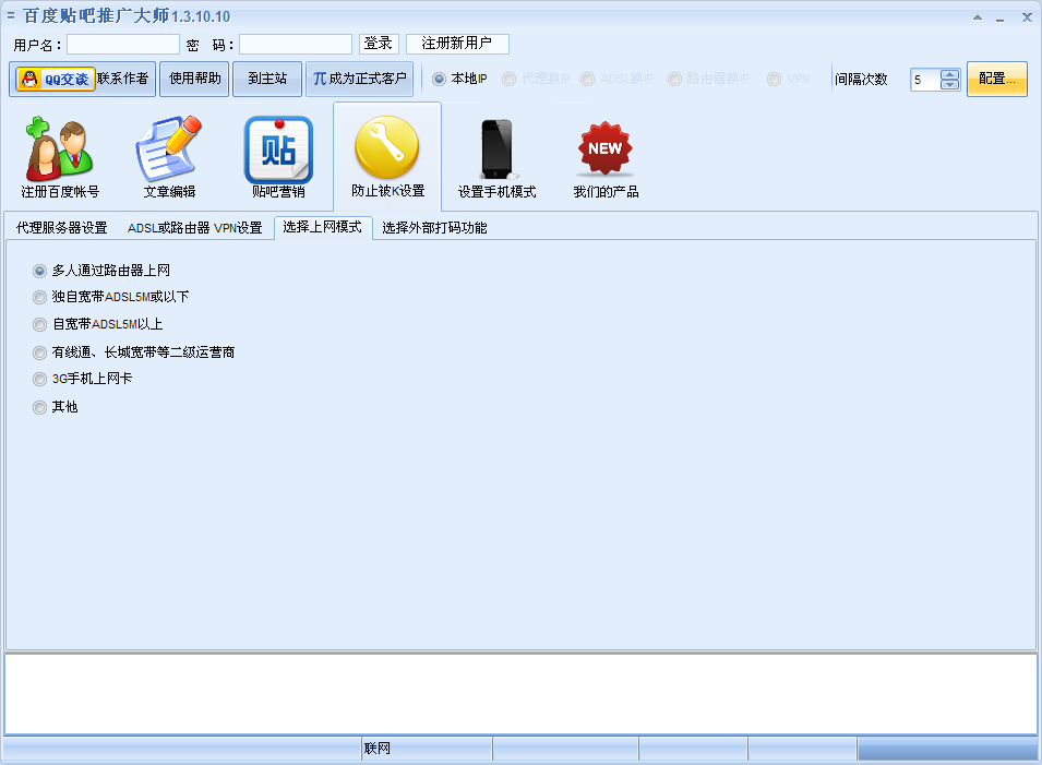 百度贴吧推广大师是一款全自动的百度贴吧推广工具,包含帐号注册、帐号激活、帖推广、文章伪原创、发帖回帖文章采集、发提升等级、回帖推广、关注喜欢贴吧等等不同功能。主动换ip,能使用代理模式、路由器换ip模式、adsl模式,操作简单,支持验证码识别,模拟手机贴吧等等功能。
