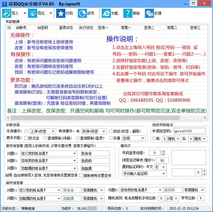 奇易QQ安全助手可以批量管理你的QQ帐号,具有批量解除限制、改密、查询、无保上保等功能,提供给需要QQ号批量管理的人使用。