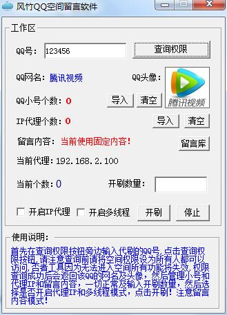 风竹QQ空间留言软件是一款最新好用的QQ空间批量留言工具,这款软件附带采集网络留言,可以帮助你通过小号在QQ空间进行批量留言,软件操作简单,首先批量导入QQ小号,之后点击登录所有QQ号按钮!然后输入刷留言QQ,点击开始按钮即可。注意正式版可以享受公共小号库和批量刷QQ留言功能,欢迎下载!