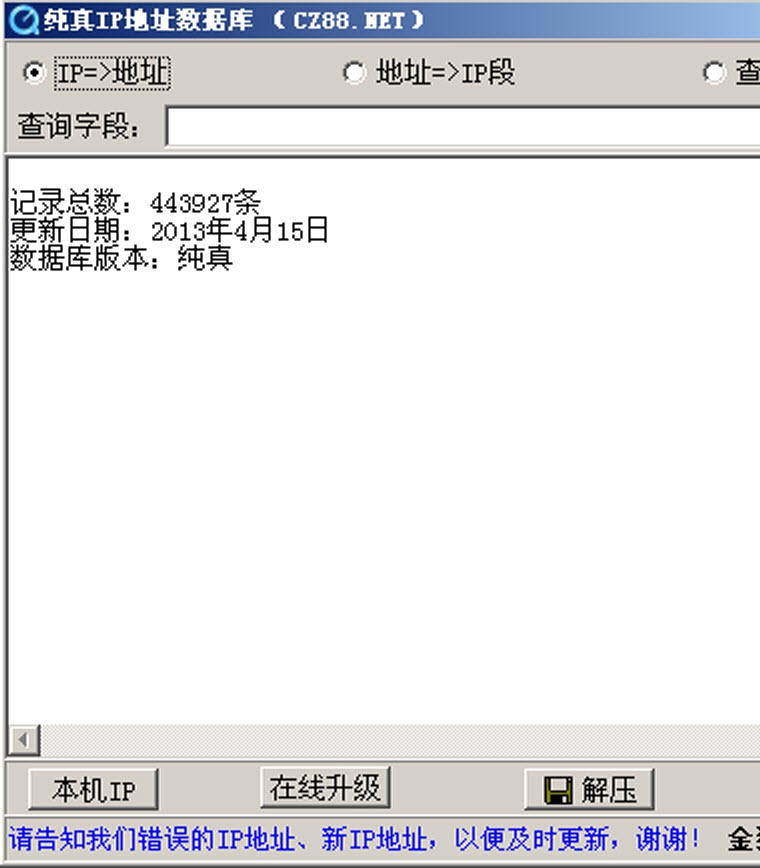 随数据库附送的查询程序(IP.EXE)具有在线检测并升级IP数据库的功能,只要运行该程序,点击右上角的“在线升级”,就可以升级IP数据库到最新的版本,无需再到下载网站下载新版的IP数据库。