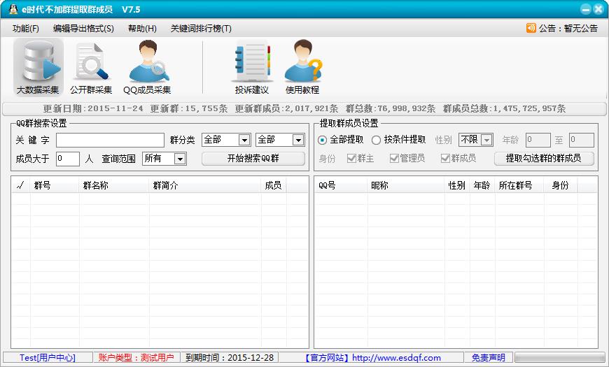 e时代不加群提取QQ群成员软件,是一款无需加入指定的QQ群,就可以实现高速、稳定、全自动的提取QQ群成员,软件支持按照性别、年龄等多种字段自定义查询!软件定期升级维护,并且采用独创的方法定期更新群成员数据,保证大家的使用效果以及用户权益!软件采用网络验证帐号形式,任何机器登录软件帐号以后,可以随时随地的使用软件,欢迎下载试用!