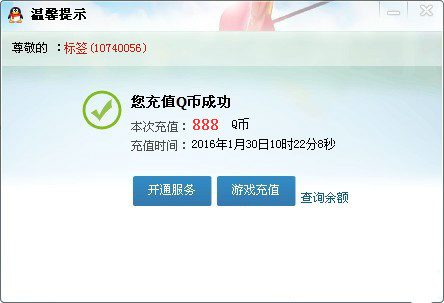 3.如图:然后就会弹出这个充值成功的截图,时间、充值的QB等等,绝对完美,发给你的小伙伴,没理由不相信.