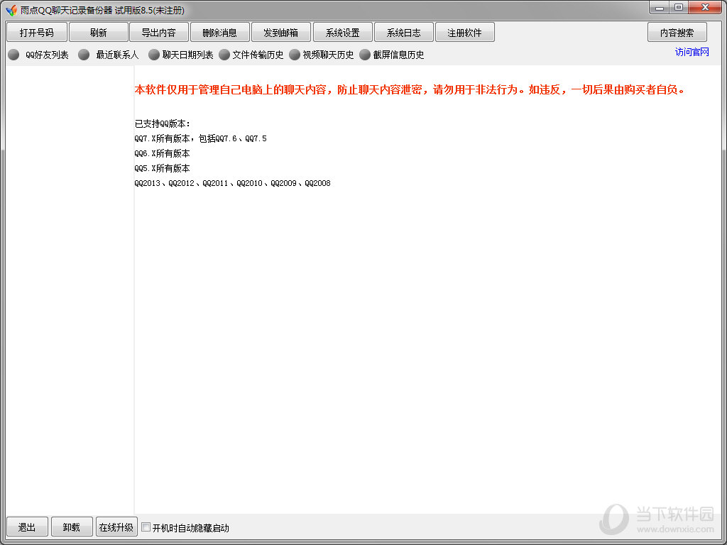 qq聊天记录查看器免费版无需密码,直接读取MSN/QQ聊天记录,还可以恢复过往的历史聊天记录和好友列表,记录结果可自动发邮箱,是目前最好用的qq聊天记录查看器。