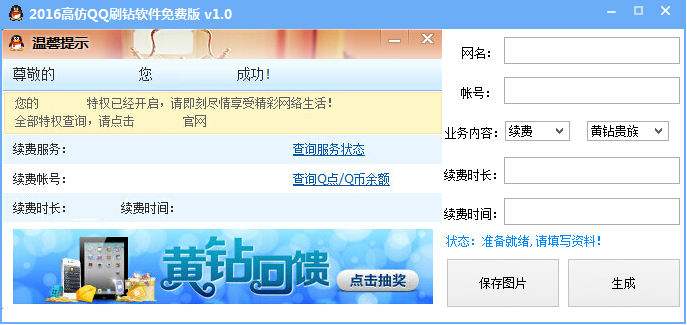 2016高仿QQ刷钻软件是一款自娱自乐的QQ刷钻装逼工具。使用该软件并不是真正的为你进行充值,而是生成一个充值成功的界面来炫一下。而在生成的时候,会在右下角托盘出现钱包闪烁和提示音,非常逼真有趣哦!非常有意思的小工具,有需要的赶紧来下载使用吧。