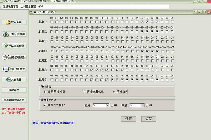 2、保护孩子视力,家长可以通过定时休息功能,规定孩子每使用一定时间后,必须休息一段时间,以达到保护视力的目的3、详细的日志记录与上网查询功能可以让你方便详细地了解到您计算机的使用时间情况;文件操作日志记录了文件的新建/复制/删除等操作,可以让你全面的了解到整个系统的文件操作情况和上网浏览了哪些网站和网页。