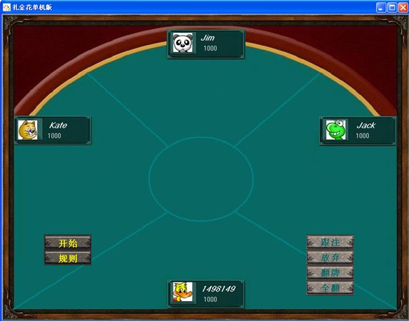 游戏:庄家的顺时针的下一家先开始下注,其他玩家依次顺时针操作。轮到玩家操作时,玩家根据条件和判断形势可以进行加、跟、看牌、放弃、开牌等操作。