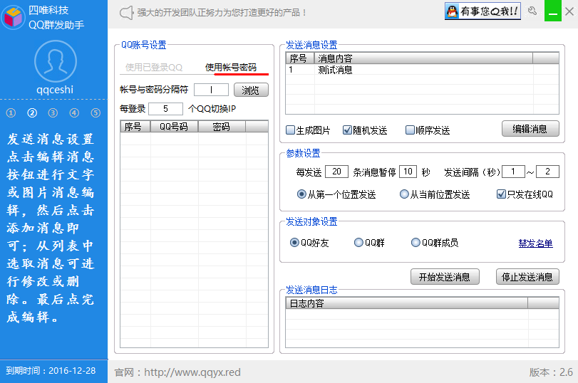 四唯qq营销软件是由四唯科技开发运营的一款qq营销软件,支持全自动发送qq消息等功能,软件采用模拟人工的方式发送信息,并自动更换ip,使用四唯科技科技自主研发防封号机制,有效降低封号风险。软件目前支持windows全系列系统,完美兼容win10,并运行于虚拟机中。