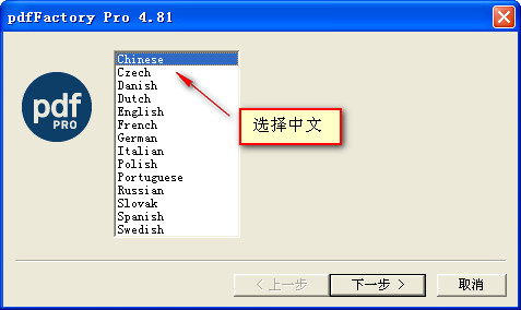 PDFFactory是PDF虚拟打印机软件,安装时中文选择方法: