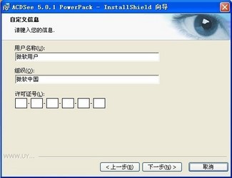 第二步:运行安装程序 第三步:ACDSee5.0安装向导界面 第四步:ACDSee5.0许可协议界面 第五步:ACDSee5.0许可证号的输入 ACDSee5.0的用户信息自己随意填写即可 ACDSee5.0的许可证号(序列号)“664-828-790-472-030-541”这个需要我们手动输入 然后点击“下一步”按钮继续操作 第六步:选择ACDSee5.0的安装类型 第七步:ACDSee5.0文件关联设置 第八步:开始安装ACDSee5.0 第九步:正在安装开始安装ACDSee5.0 第十步:开始安装ACDSee5.0安装完成