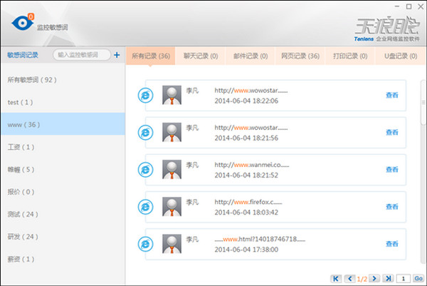 网页记录:详细记录网页浏览信息,如URL、网页标题、浏览时间等,支持关键字查询功能。