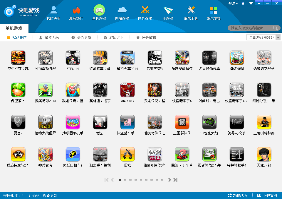 快吧游戏是一款简单易用的游戏管理软件,提供了上千款热门单机游戏,一点即玩,为用户省去了找游戏、下载、安装等繁琐的步骤! 快吧游戏管理用户电脑中的所有单机、网络游戏,为用户提供一个安全方便的游戏桌面。游戏安全所有推荐的游戏都经由七款权威杀软和360安全卫士检测,轻松规避网络病毒风险,安全放心有保障。一键安装只需轻松一点,实现游戏的下载、安装、运行,减少用户麻烦,节省玩家时间。游戏资讯最全的游戏介绍,最新的游戏攻略,最丰富的游戏图片,方便用户掌控每款游戏。