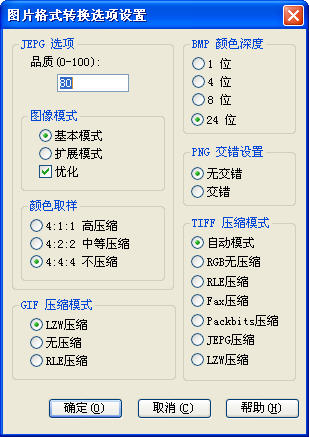 2.目前支持图片转换的格式有:BMP JPG GIF PNG CUR TIF TGA PCX WBMP WMF JP2 JPC PGX RAW SKA。