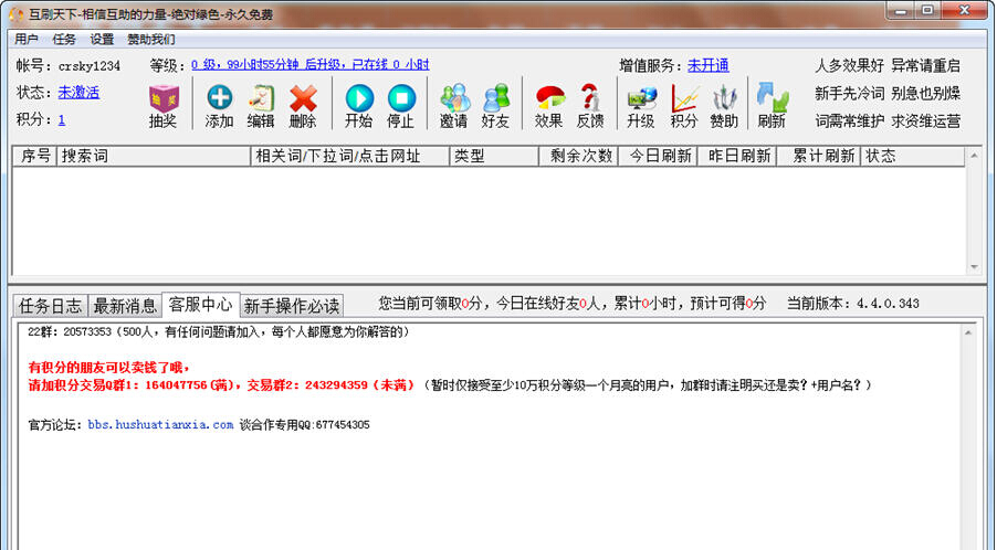 互刷天下是一款免费的网站关键词互刷工具,当您挂机运行软件时,软件会自动点击别人的任务。点击一次,您会得到1个积分。当您添加任务后(挂机运行的情况下时),您的任务会自动分配给其他用户去点击。被点击一次扣掉1个积分。