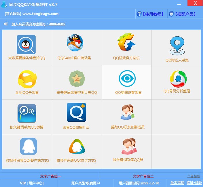 同步QQ采集分析软件,一款综合的QQ信息采集软件,支持精确条件查找QQ、QQGame客户端采集、QQ空间采集、QQ论坛采集、QQ群采集、QQ空间访客采集、QQ群号码采集、按关键词采集空间日志QQ、QQ客户端采集、QQ拍拍采集等众多信息,采集速度快、精确度高、资源广,是您做营销、找意向客户的必备工具!