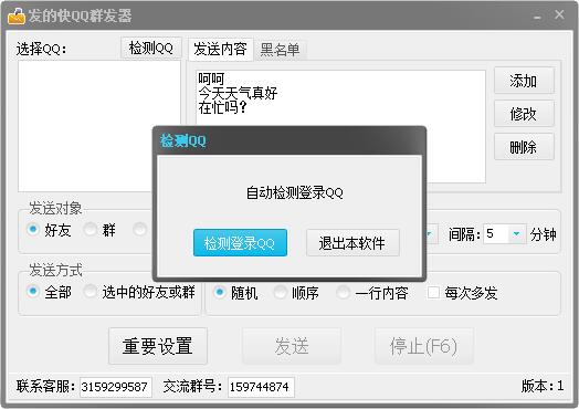 支持所有版本的QQ,支持所有系统 支持多QQ发送,循环发送 支持支持多内容顺序,随机,选中自由切换发送信息 支持图片发送功能 支持支持发送名单功能可减少屏蔽功能 支持群成员发送自动跳过管理员功能 支持发送完关机功能 支持循环发送,连续发送,切换内容发送等一系列功能