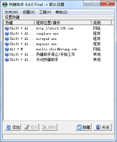 热键助手是一款帮助用户自定义一些常用功能快捷键的工具,windows系统自身会自带一些常用功能的快捷键,不过这些热键并不能满足所有人的需求。这款软件可以让你方便的定义自己的热键。您可以通过添加自定义热键方便的实现用热键打开指定程序、网址等操作。在新版本中还加入了对指定操作的支持,如热键关机、热键打开\关闭光驱等功能的支持,而且功能还在不断完善中。热键助手操作简便,即使您是在没看帮助的情况下第一次使用也不会有什么困难。
