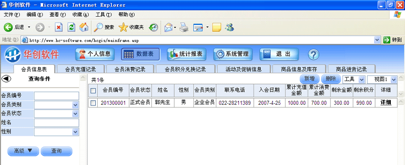华创会员管理系统能让用户自定义各种数据表,能管理各种信息;无需编程、简单易用,能轻松构建适合自己的、网络版的信息管理系统。