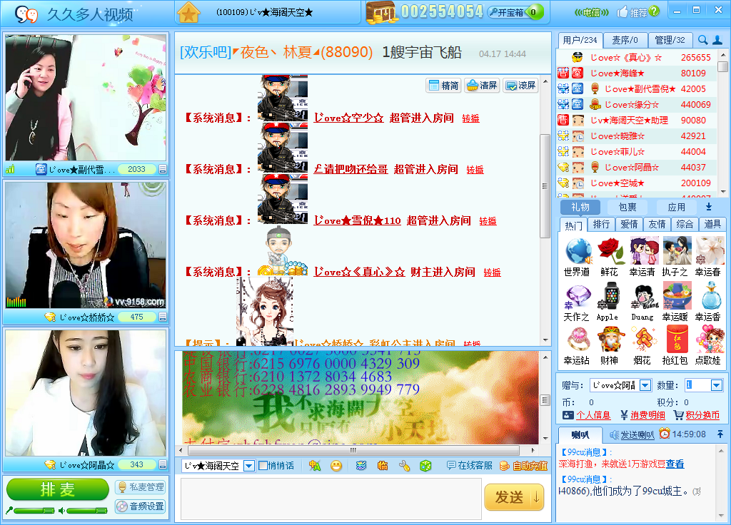 99cu多人聊天室是专门为中文用户量身定制的一款社会化多人视频直播平台 ,提供了稳定流畅的三路视频百人聊天室。目前,已经开通了基于客户端的视频聊天, 网络直播,影视播放,IM,百人聊天室,在线视频录制,在线游戏等互动设置。