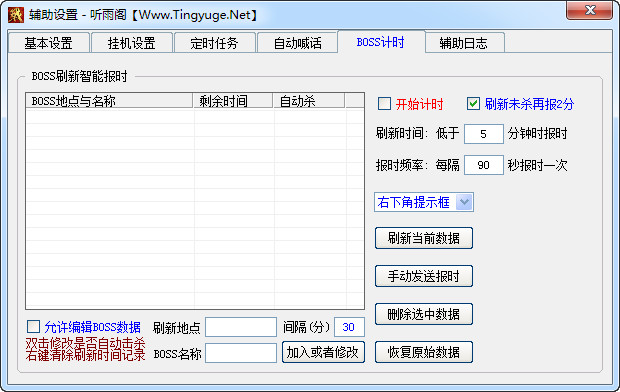 V5.6.2 增加一键全部停止(方便野外遇敌); 双击可手动设置单个BOSS刷新时间; 分设普通和高级BOSS跑图和捡物时间; 增加冰火战场小号自动挂机送分; (切换送分小号后重新打勾);