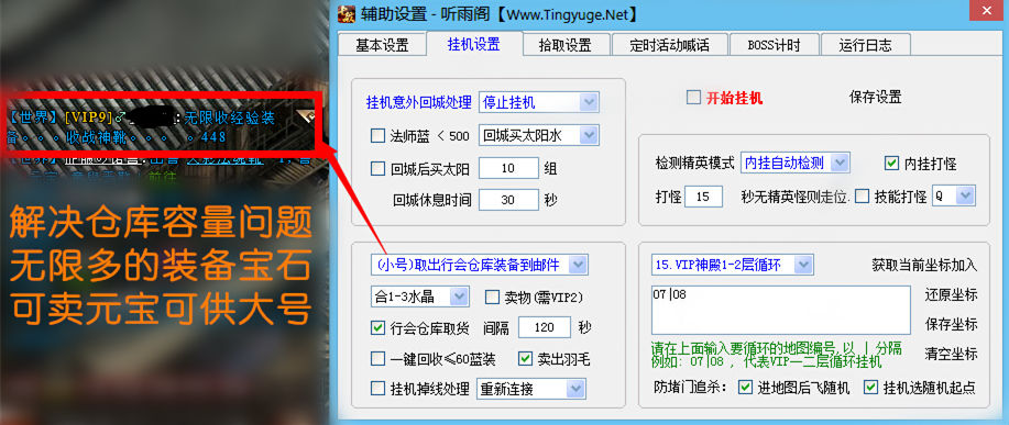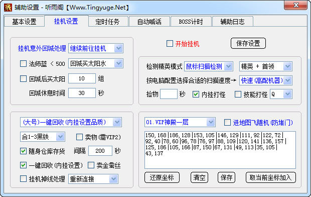 听雨阁战天辅助是一款关于传奇类热门页游《战天》的绿色免费辅助工具,主要功能有快速买药;全自动任务;挂机刷精英(自动跑图,修理,回收,掉线重新登录);小号打装备供应大号;BOSS智能计时;自动喊话等。几个简单的设置就能让你在游戏里体验升级与帮战PK的快感。