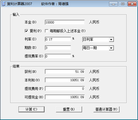 复利计算器是理财达人必备的工具,可根据本金、利率、期数、提现费率来快速计算出获利和本利和及可提现金数。复利是什么?复利就是指你的本金+利息也能得到利息。正常的利息只是表示你的本金能得到利息。比如同样是投资10万,你能找到一份年回报30%的投资,不按复利计算30年后将变成100万。如果你能找到一份年回报30%的投资,按复利计算30年后将变成26200万。