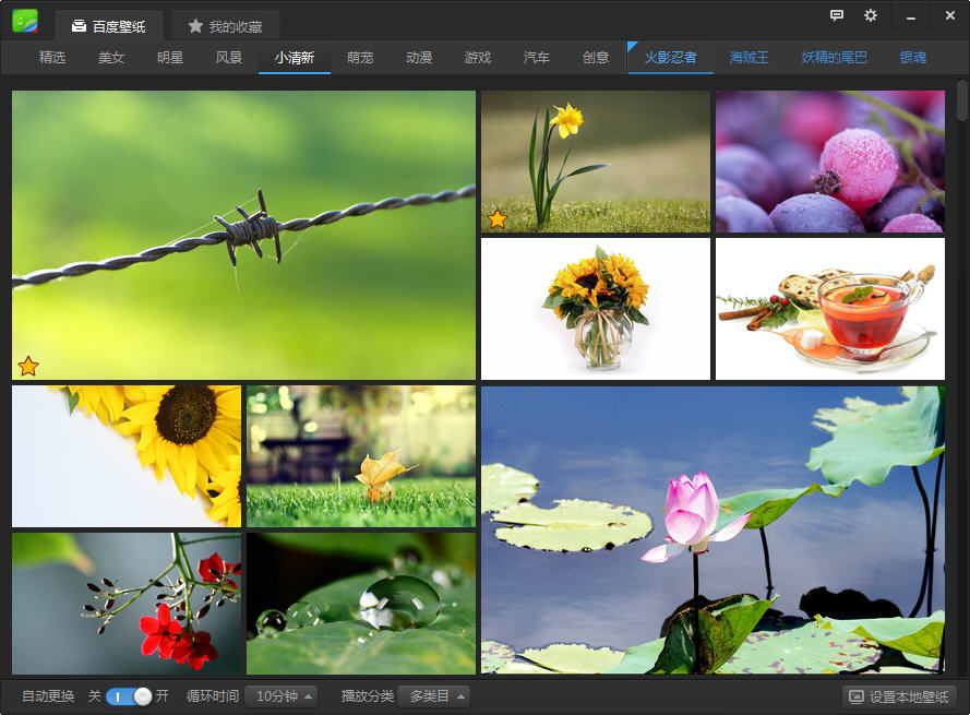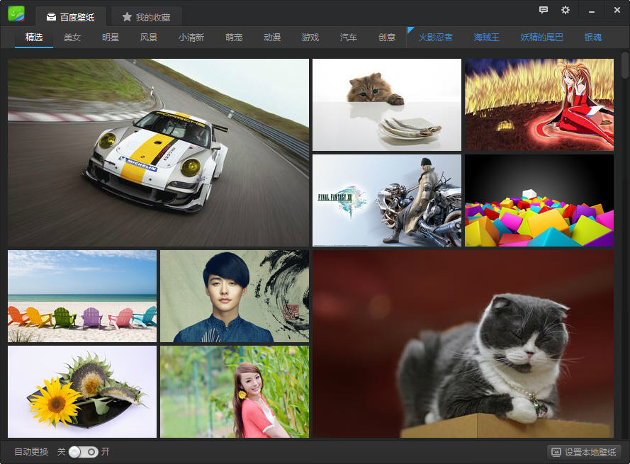 谁说壁纸一尘不变,谁说壁纸不尽人意,用百度壁纸,你可以从百万高清网络库中挑选你喜欢一批壁纸放入自己的分类目录进行轮播,随心情随主题,任你更换。