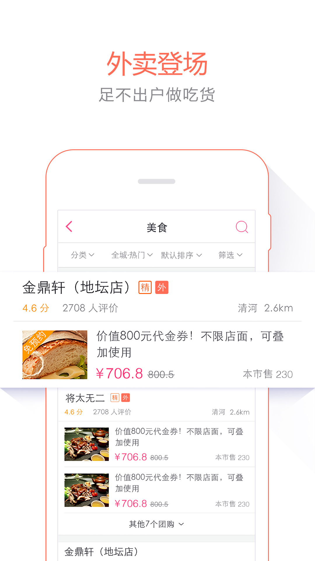 筛选:分类+商圈组合筛选,支持价格、距离、销量等多种排序方式;