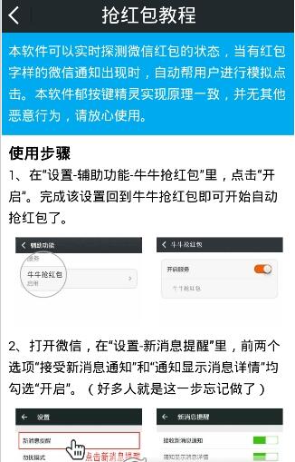 只需要根据提示在手机上安装软件,当微信里出现红包时,我们的程序将自动启动,将红包抢入你的囊中。