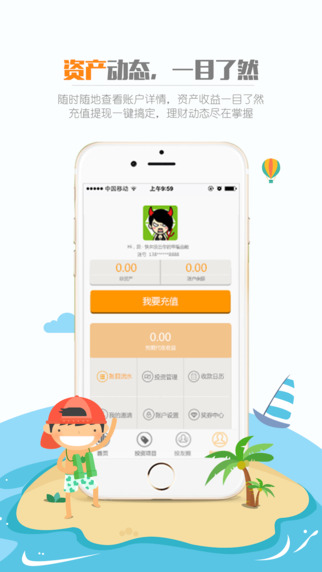 3.账目查看:充值、提现、账目流水,投资管理,银行卡管理,邀请好友、奖券中心等功能,均可一键查看;