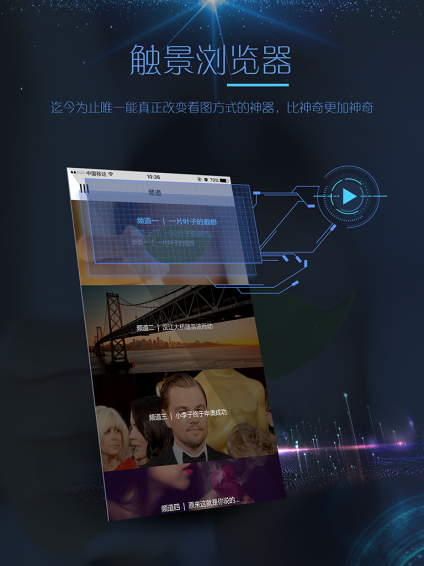 触景浏览器并不是常规意义上的搜索浏览器,而是改变看图方式的高逼格神器,代表了科技前沿。通过增强现实技术,触景浏览器能让定格时间的照片重新“鲜活”起来,链接无限可能!
