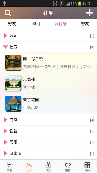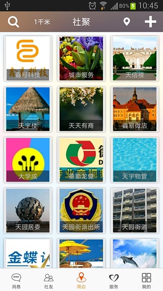 3、“周边”是基于当前地理位置查找相关的公社号。