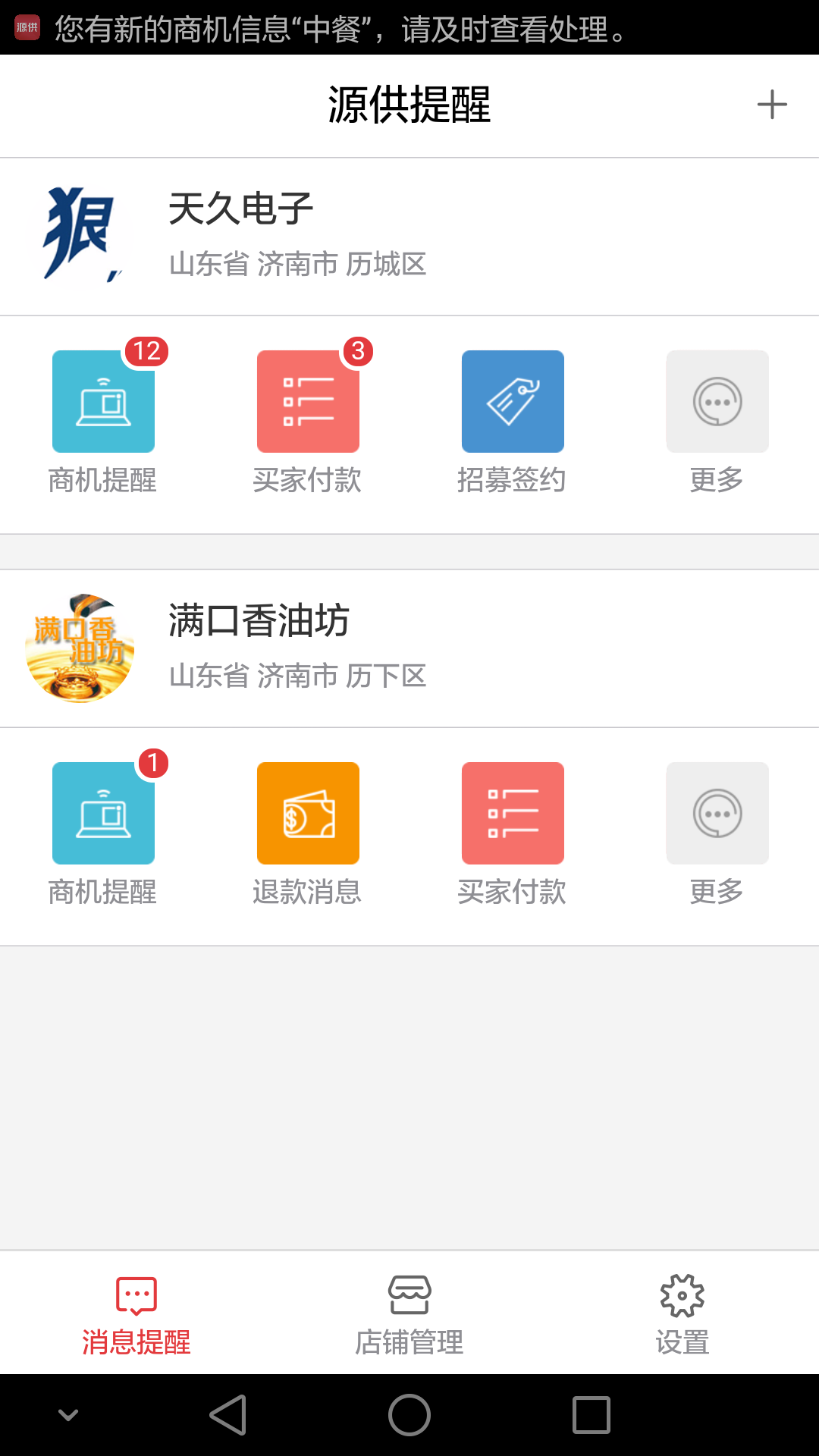 源供是源秘商机提醒的客户端,源秘会员提交需求后,形成商机,店铺管理员登陆源供提醒后,可以收到经营类目内商机提醒。商机提醒会以消息形式推送到移动端,在状态栏中显示,点击后可以查看。