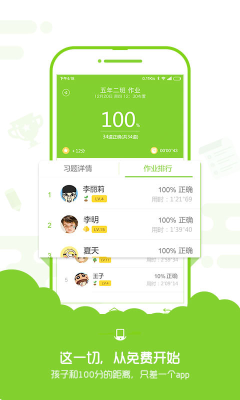 6、即时排行:随时查看自己的班级排名、学校排名、全国排名;