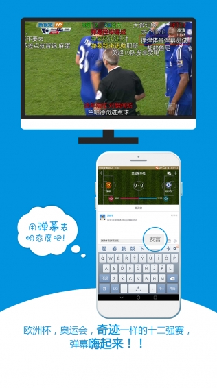 弹弹体育是新型看球神器,能让您躺在沙发上看电视球赛时,边聊天,边吐槽,边主播,和朋友在自家电视屏幕上一起乐享体育。 弹弹体育不改变您原有的收看习惯,现在您可以同万千球迷一起在弹幕里吐槽,可以找到同一支球队的球迷一起喷黑裁判,可以和小伙伴们足不出户“面对面”畅聊,还可以给美女小白球迷当解说。