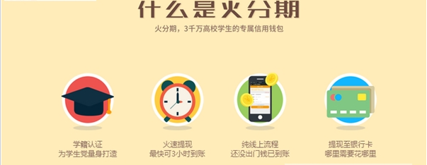 1、火分期具有低于信用卡50%的利率,仅为0.99%的利率就可以贷到100-20000元不等的资金,大大解决了大学生创业、学习生活消费的需求。