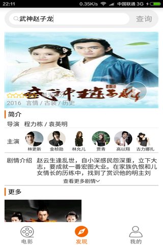 发现:搜索电影信息,了解相关影片介绍及查看更多主角相关电影信息及相关影院的上映日期。