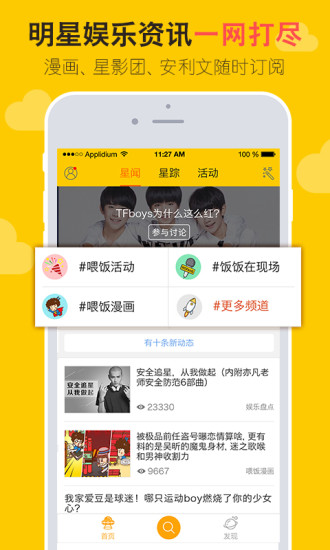 喂饭是一款专门为粉丝打造的追星软件,粉丝能够在喂饭APP中随时掌握明星最新行程,免费参与全国各地的明星活动、加入粉丝会、欣赏明星海量高清大图。喂饭APP--让追星更简单。