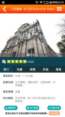 4、 最个性化: 澳指南支援把景点或商户加入我的最爱,方便随时快速查询,结合地图功能即可建立自己的行程,澳门旅游攻略尽在於此