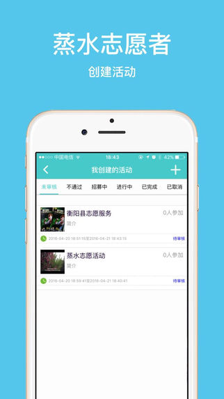 蒸水志愿者是一款为支援打造的社交软件,可以在线创建自己的志愿者活动,发布志愿活动资讯,招募更多的志愿者踊跃加入。